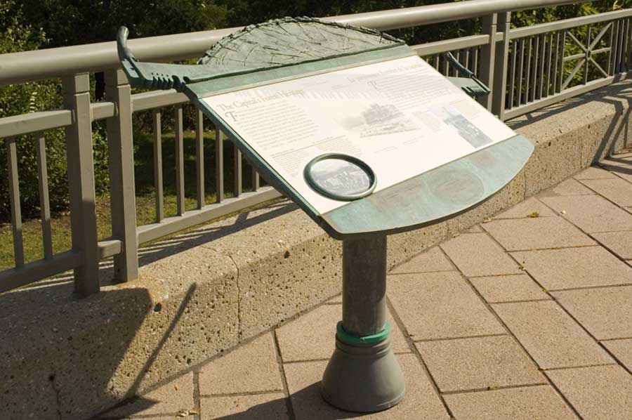 Highlights: These (10) plaques contain both original artwork and 3 dimensional cast artifacts relevant to the history and story they are portraying. Cast from solid bronze and patinaed with SML's True-Green® formula, these plaques will endure the harsh conditions of Canada's climate for many years to come. Each plaque is mounted to a concrete pillar atop paver's slabs, with (3) of the plaques mounted to bridge decking.