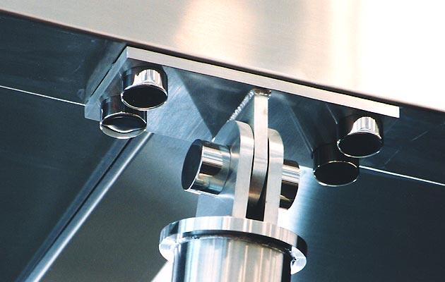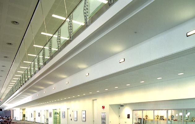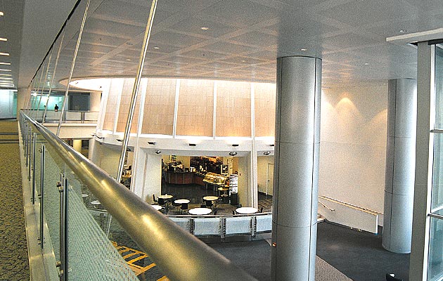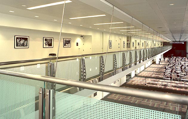 Highlights: Field dimensions yielded slab alignment variances in excess of 4" off plumb. Our designers and site forces overcame this problem by introducing structural shims that resulted in a "gun barrel" straight installation. Over 200 fritted glass panels and 1300 linear square feet of balustrades.