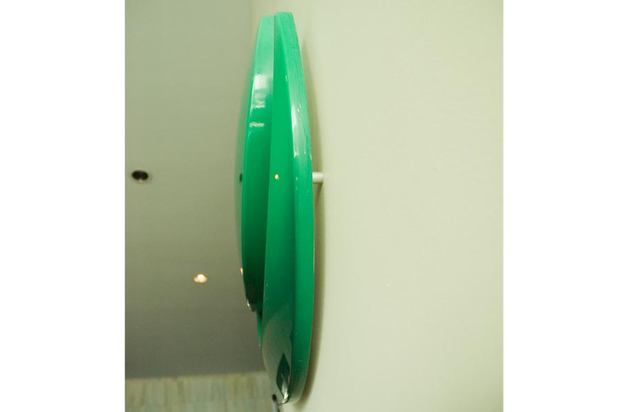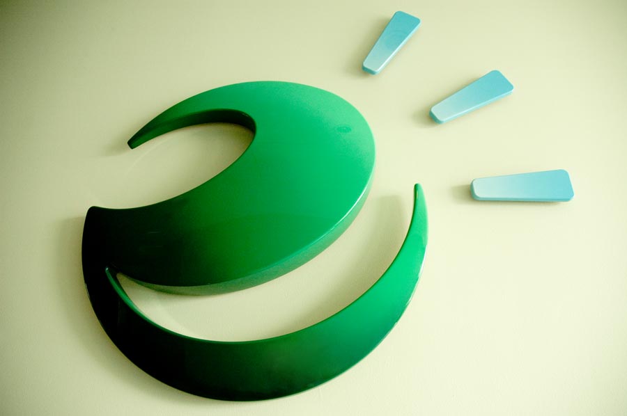 Highlights: 26" diameter logo and lettering and (3) rays on logo in 1/2" thick acrylic. Logo is cast in acrylic gypsum cement with a air brushed high gloss finished. All lettering and rays are painted acrylic. Signage is pinned mounted onto drywall complete with spacers.