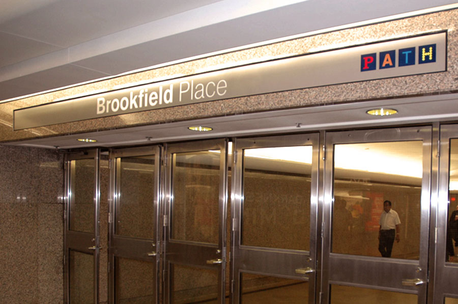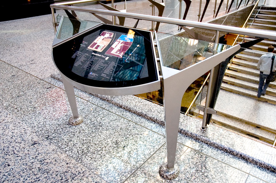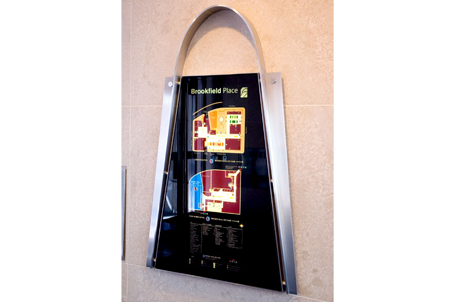 Highlights: These directories and signs are varied in materials and design to suit the location they are in, within the Brookfield Place office complex. Materials range from 1/4" stainless steel and tempered 1/4" glass inserts for the upright brochure holders and directories to modern molded plastics and aluminum for wayfinding signage.