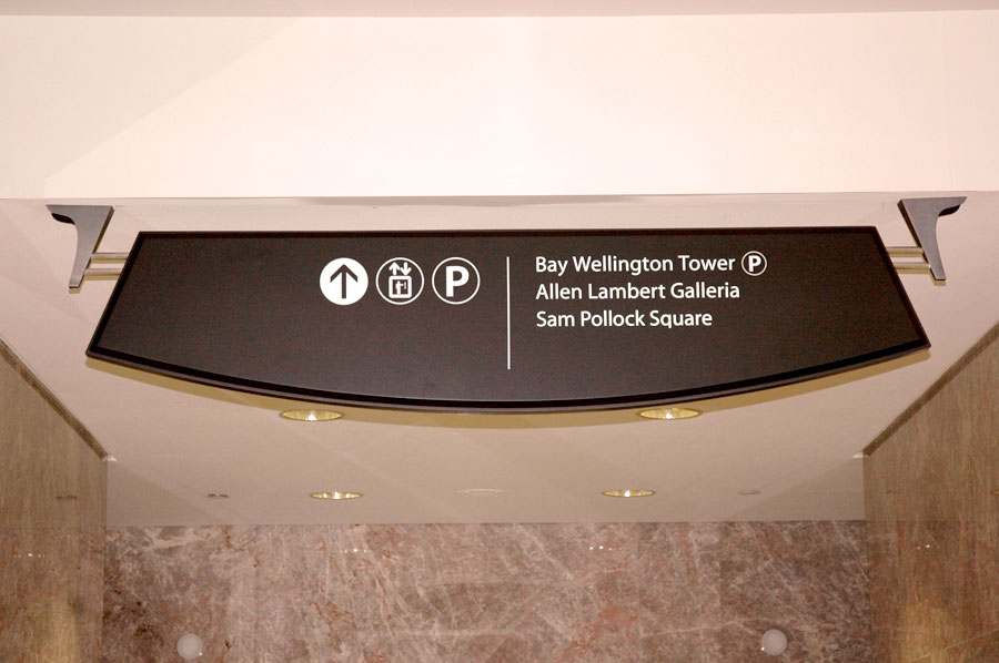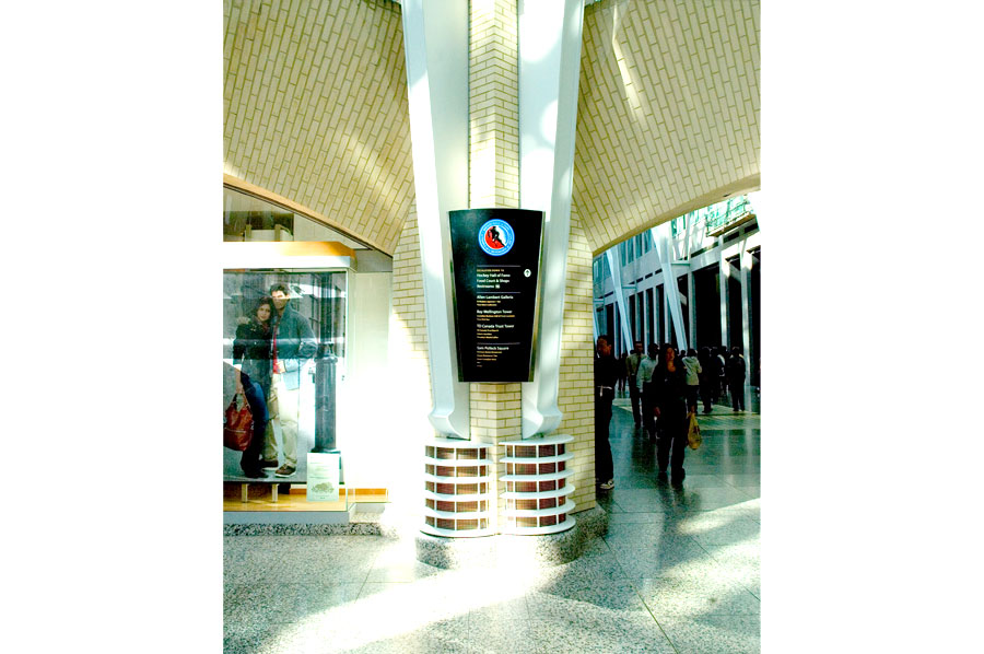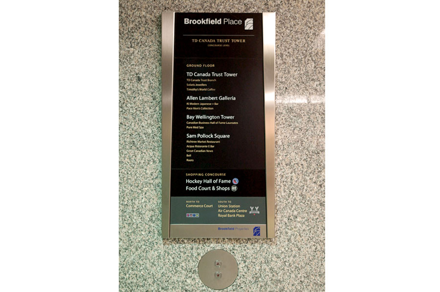 Scope: Soheil Mosun Limited was contracted to design and install the wayfinding signs and directories for Brookfield Place, previously known as BCE Place, a class "A" office complex in Toronto's financial district.
