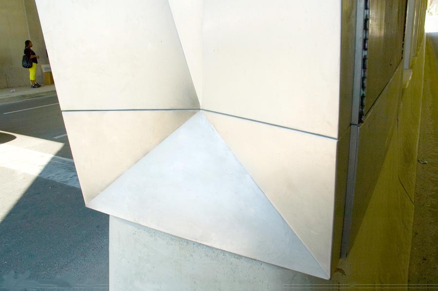 Highlights: The supporting structure beneath the cladding is comprised of galvanized steel angle tube clamped without driling or welding to the existing bridge structure. All hardware fastening is stainless steel. The exterior cladding is alloy 316 exterior high grade 16 Gauge stainless steel with a non-directional orbital finish. Cladding is mechanically fastened and welded to the underlying framework with no visible fasteners. The cladding is formed in a diamond shaped angular shape in both concave and convex formation. Perforated access panels wrap to the inside of the underpass and elegantly hide the various mechanical necessities while allowing for water drainage.