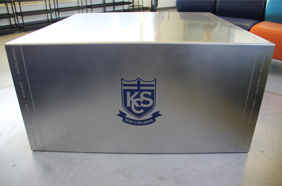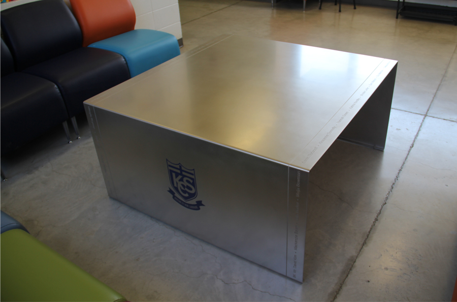 Scope: Soheil Mosun Limited gifted this stainless steel table featuring the school logo etched and infilled on one side, the names of the teachers and students of the graduating class of 2016 etched into the table surface and borders and the words Class of 2016 etched and infilled on the other side of this solid, one piece, formed stainless steel table.