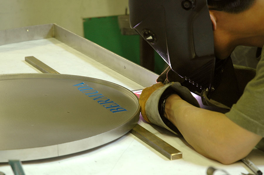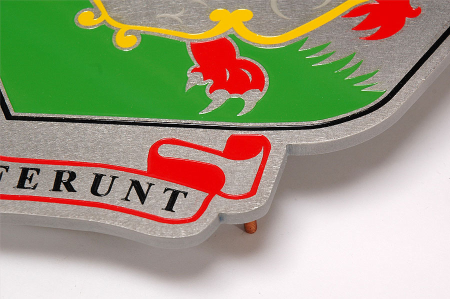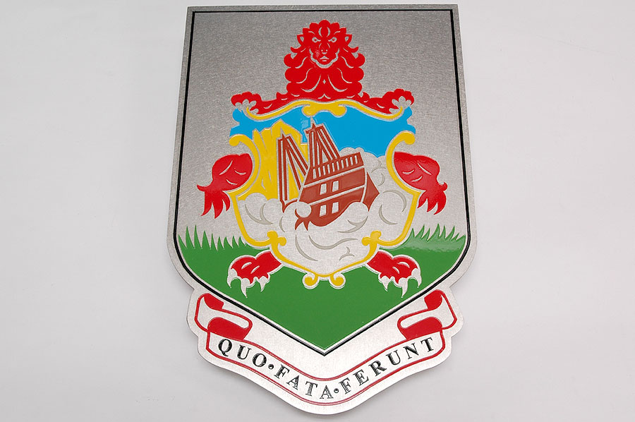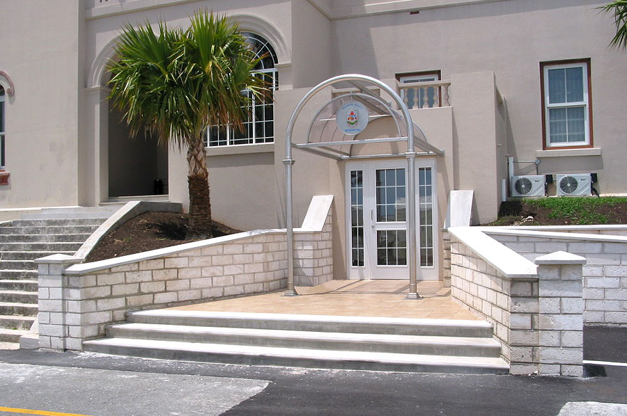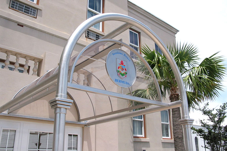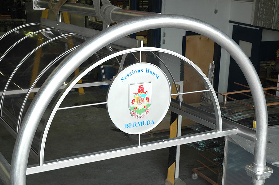 Highlights: The canopy is made of 316 St. Stl. alloy with orbital brushed finish and glazed with 3/8" thick rolled Lexan panels using minimal fasteners. The front of the canopy is accented with a complex, waterjet cut, etched and multi-coloured infilled crest on a suspended St. Stl. plate. The structure was designed to withstand varying Bermuda weather conditions.