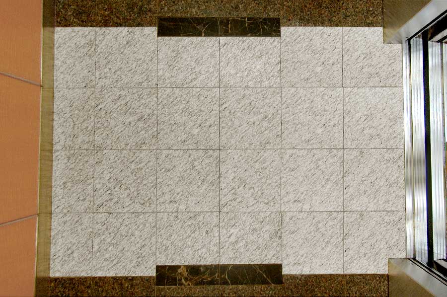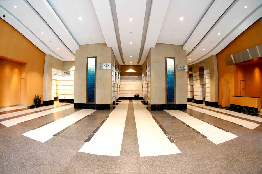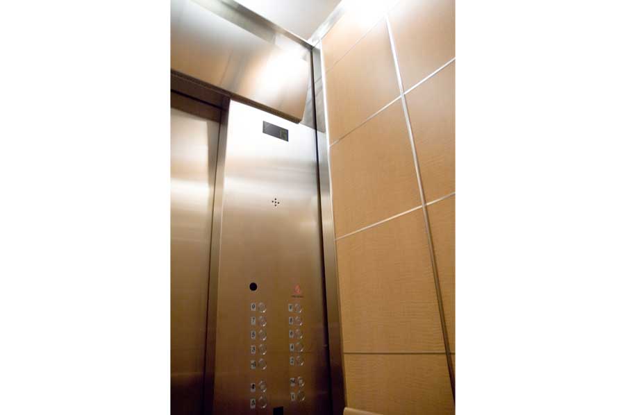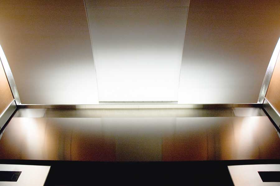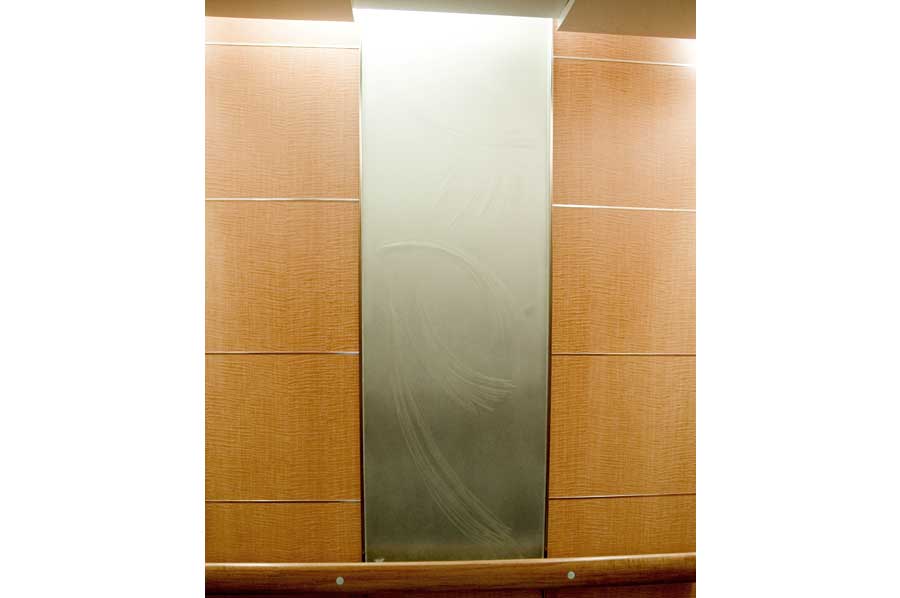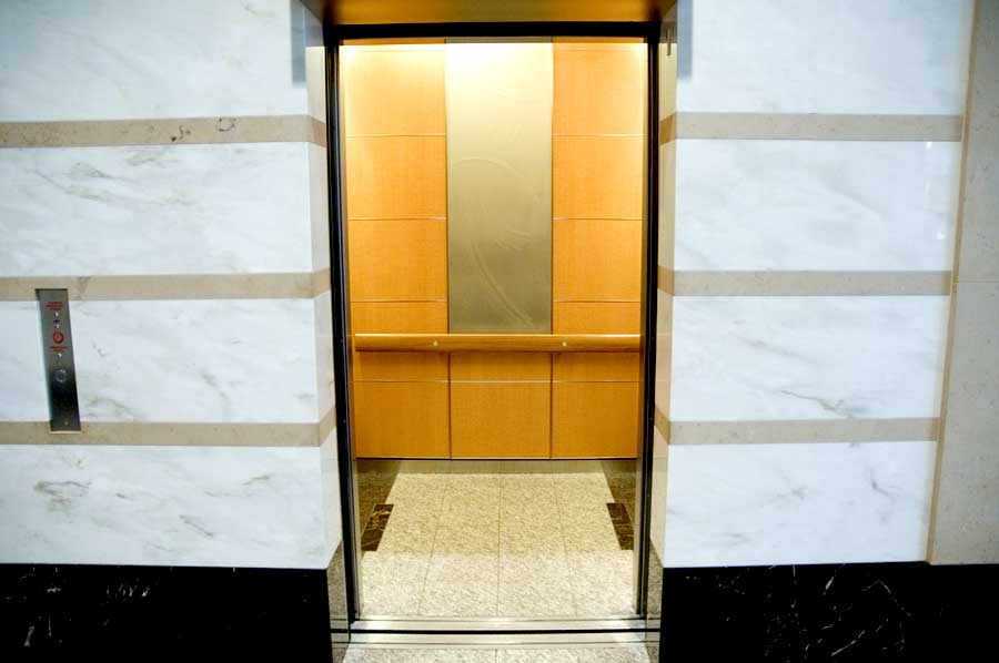 Highlights: These elevator cabs feature anigre veneer paneling with stainless steel trim. Handrails are solid wood and the ceiling is painted aluminum formed in an undulating shape to match the main lobby ceilings of the building. Floor is lightweight, thin cut granite. Etched mirrors are featured in the rear corners of the cab with a large rectangular slab of etched and sandblasted glass complimenting the rear wall of the cab.