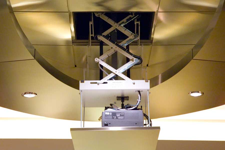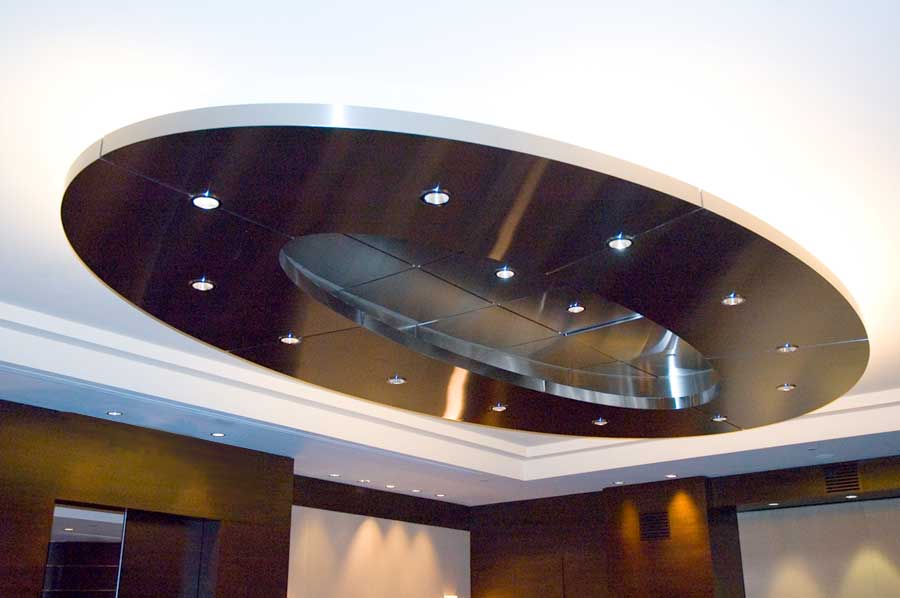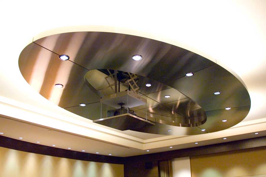 Scope: Soheil Mosun Limited was contracted to fabricate and install (2) elliptical stainless steel ceiling fixtures that provided primary lighting and had hidden projection units with remote control accessibility built into them.